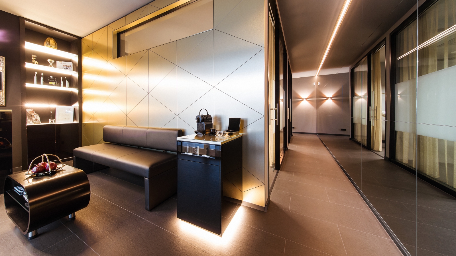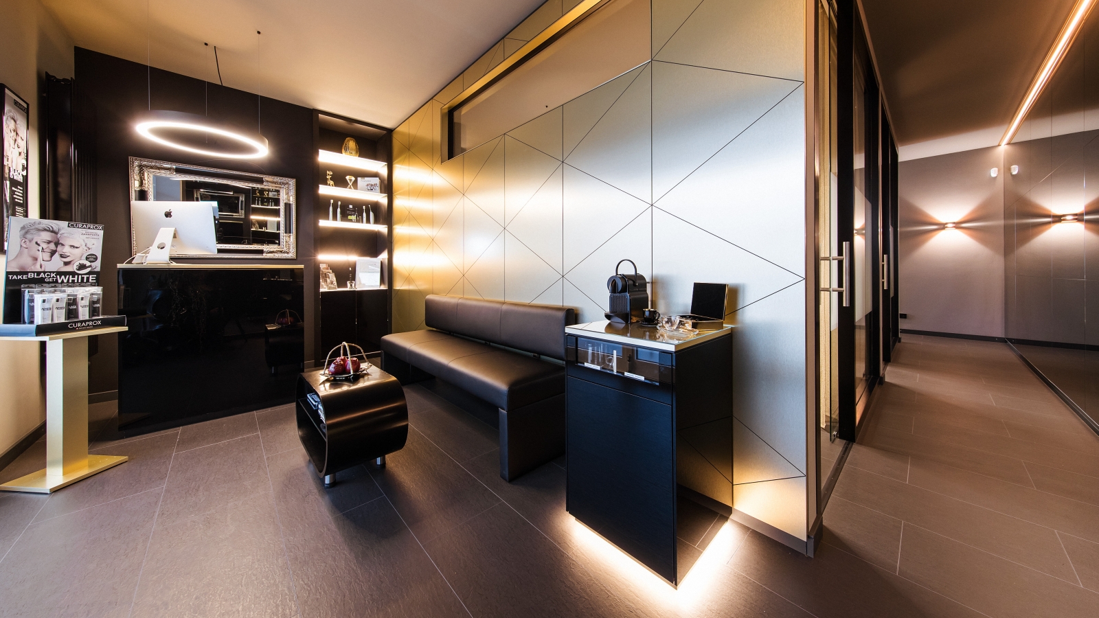 Prophylaxe-Studio Empfang mit Trophäenregal und Wandverkleidung in schwarz mit gebürsteter Messingoberfläche Prophylaxe-Studio Empfang mit Trophäenregal und Wandverkleidung in schwarz mit gebürsteter Messingoberfläche