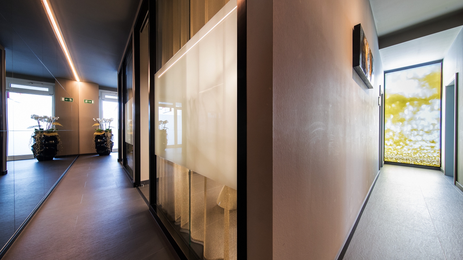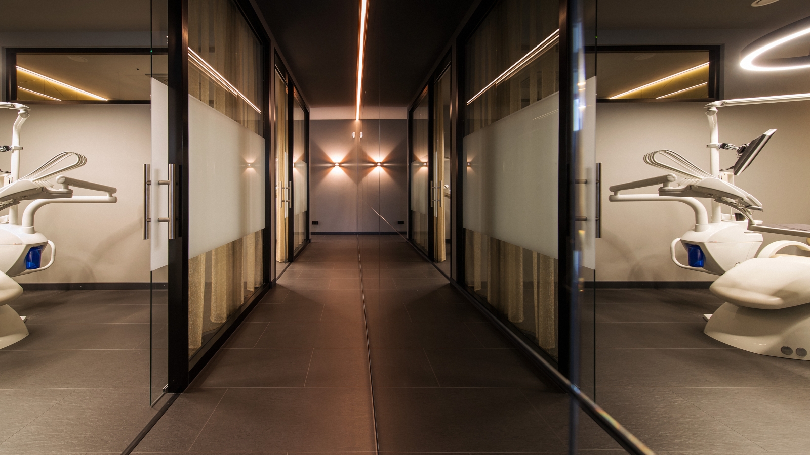 Prophylaxe-Studio Spiegelwand mit Parsol-Spiegeln und Blockrahmenelementen mit Glasschiebetüren Prophylaxe-Studio Spiegelwand mit Parsol-Spiegeln und Blockrahmenelementen mit Glasschiebetüren
