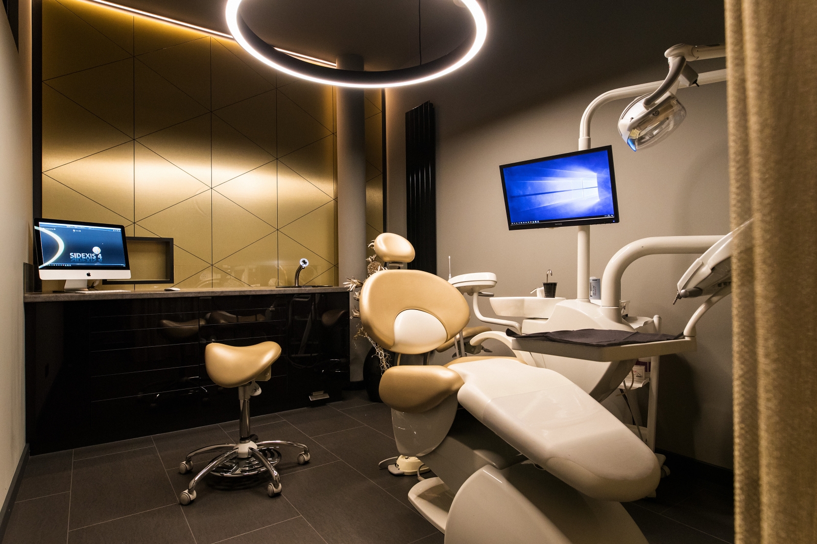Prophylaxe-Studio: Wandverkleidung in schwarz mit gebürsteter Messingoberfläche Prophylaxe-Studio: Wandverkleidung in schwarz mit gebürsteter Messingoberfläche