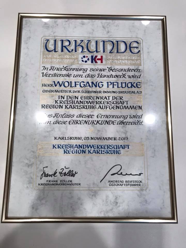 Wolfgang Pflücke wurde zum Ehrenobermeister der Schreiner-Innung Bruchsal ernannt